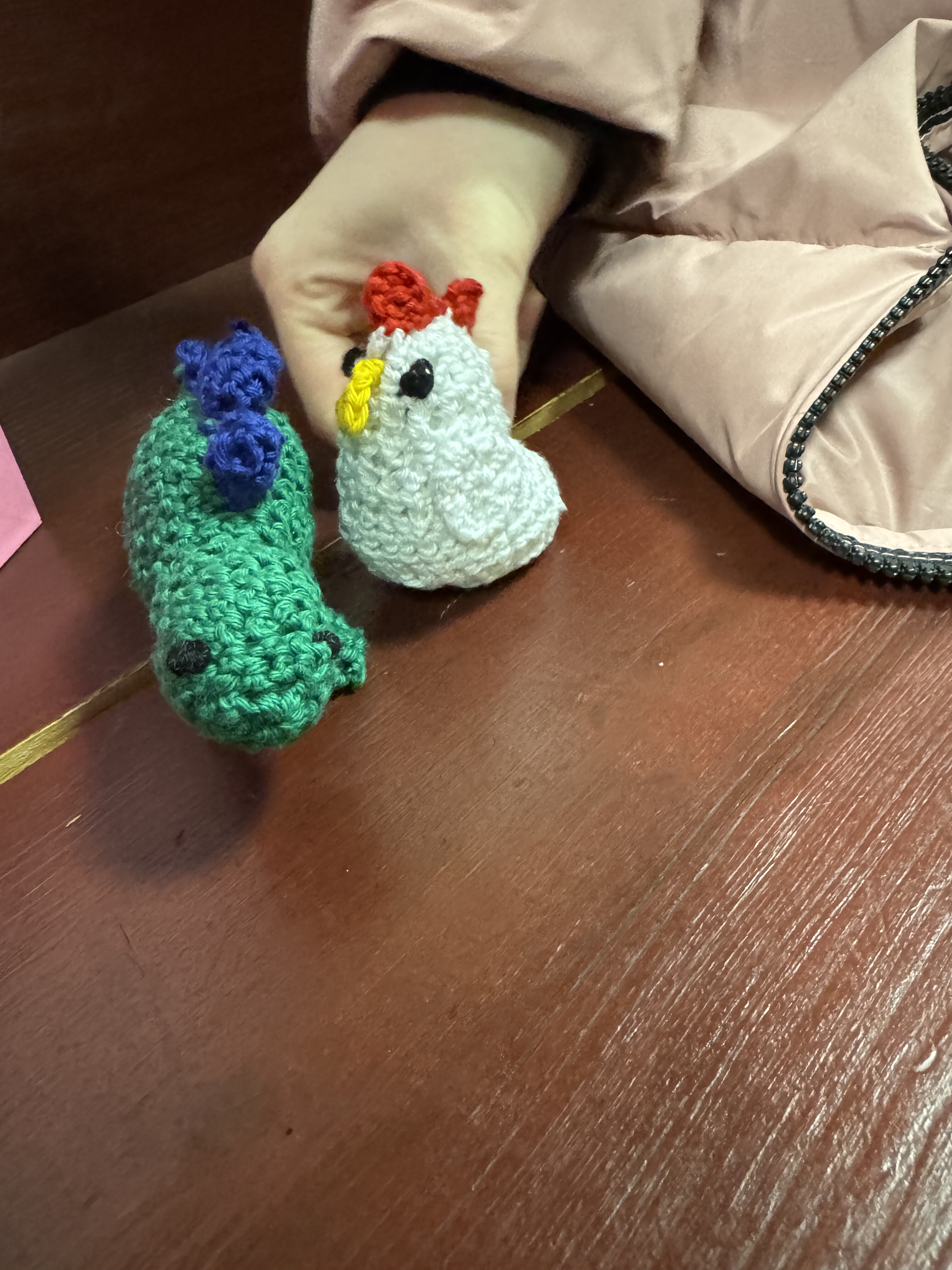 Käthe has been relearning how to crochet this year and started up again by making little friends (chicken, dinosaur, and seahorse) for some of her dance friends!