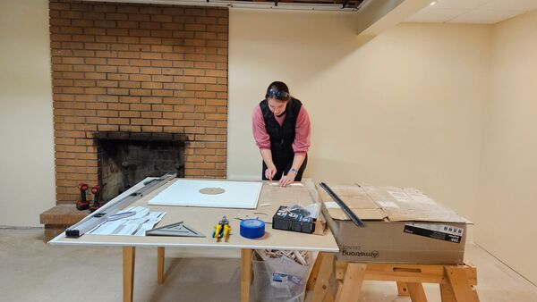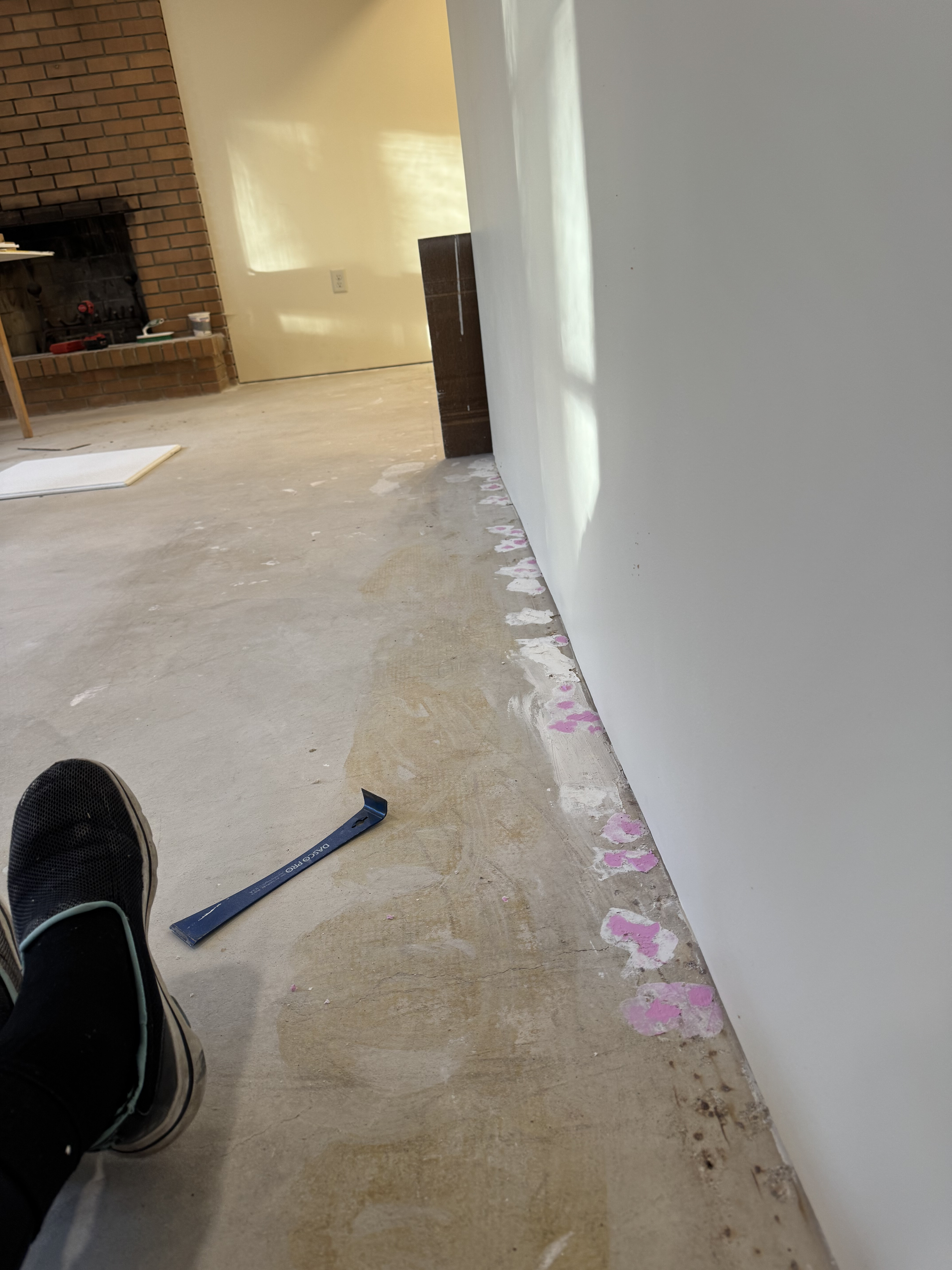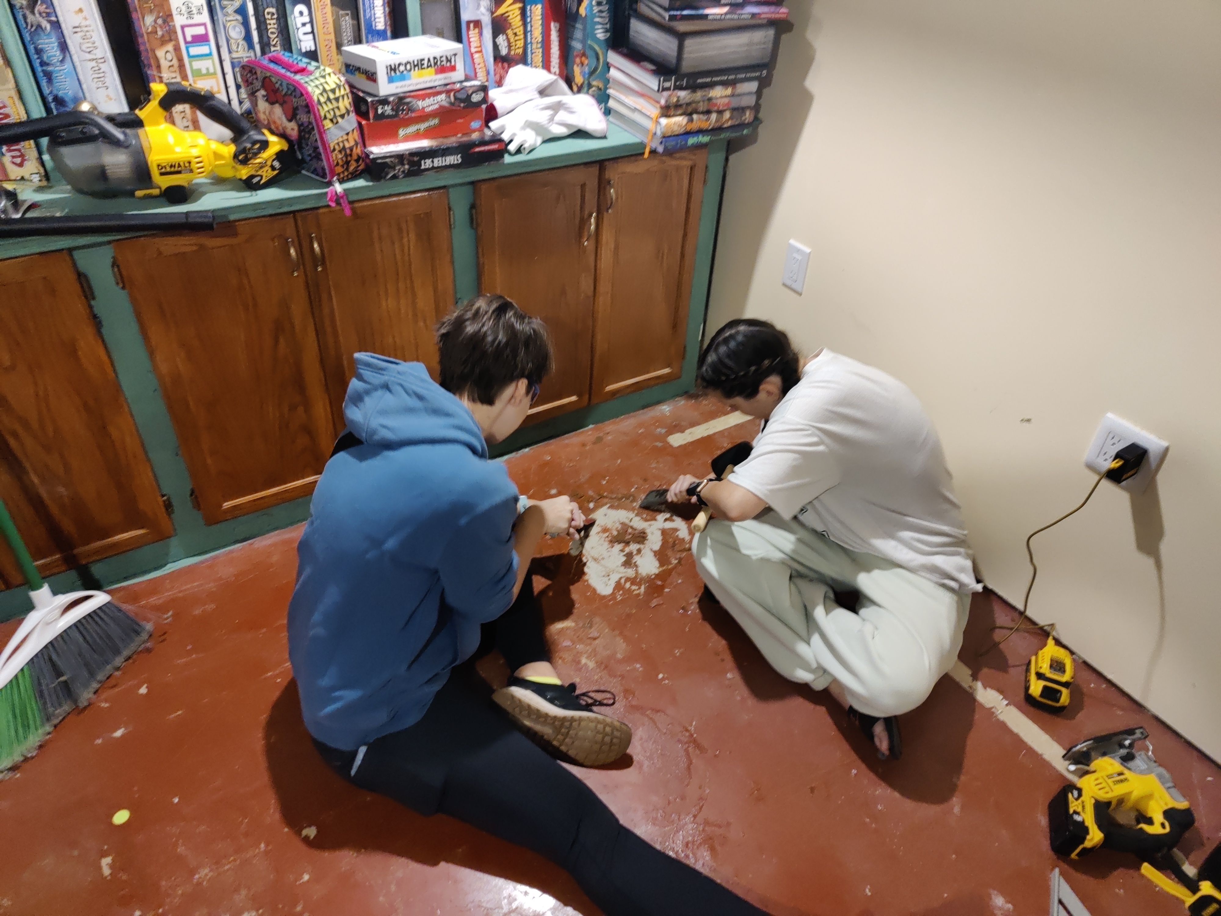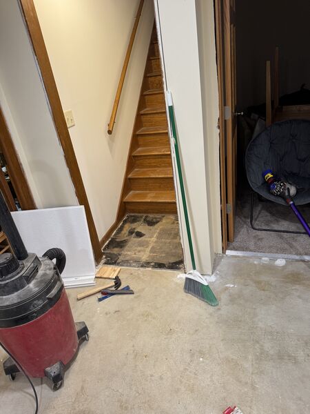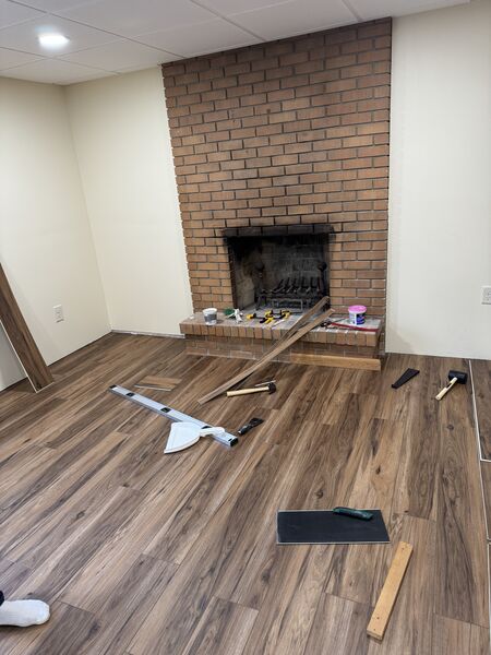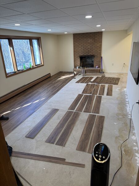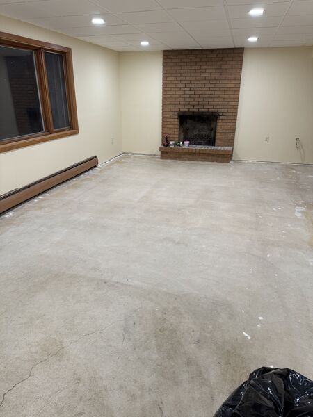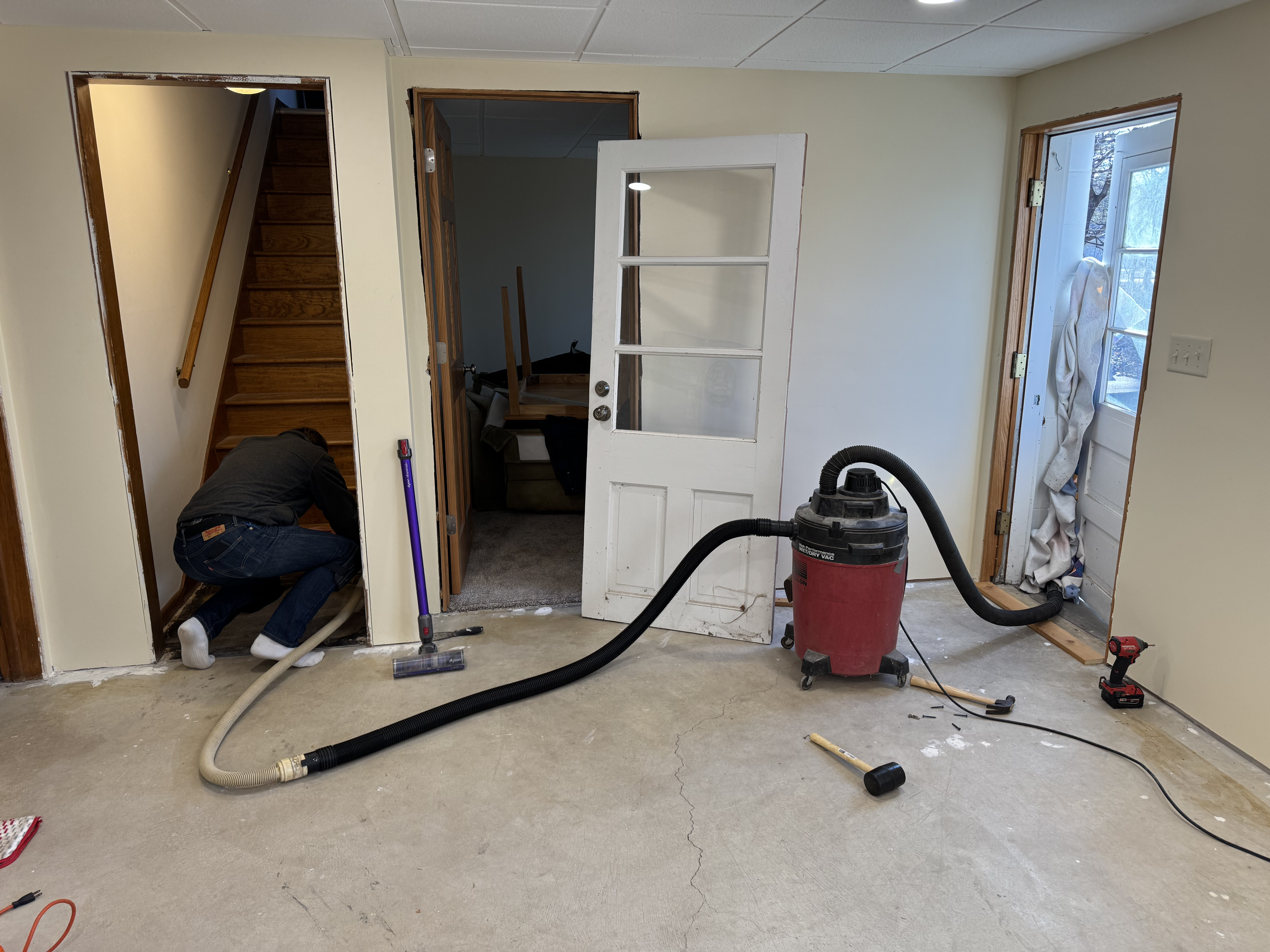 After completing the ceiling, it was time to move onto working on the basement floors. Prepping for floor installation meant making sure the concrete was as flat and clean as possible so there was a lot of divot filling, vacuuming, mopping, vacuuming again, and mopping again.