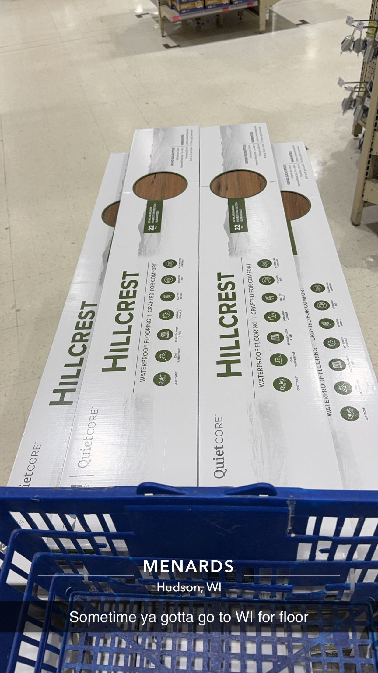 With the floor relatively prepped, we decided it was time to go actually purchase the LVP… right after we had dinner at the Original Malt Shop. Unfortunately, upon arriving at the St. Paul Menards, we discovered that the floor that had been in stock the week before was gone and there was none at any of the nearby stores. Fortunately, we had juuuuust enough time to drive to the Hudson, WI store and pretty much clear them out of the style we wanted.