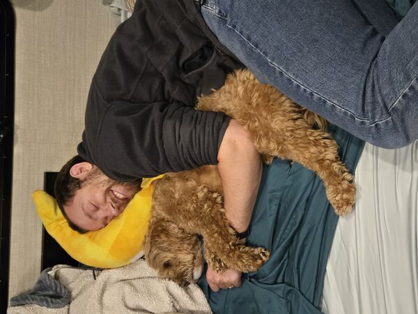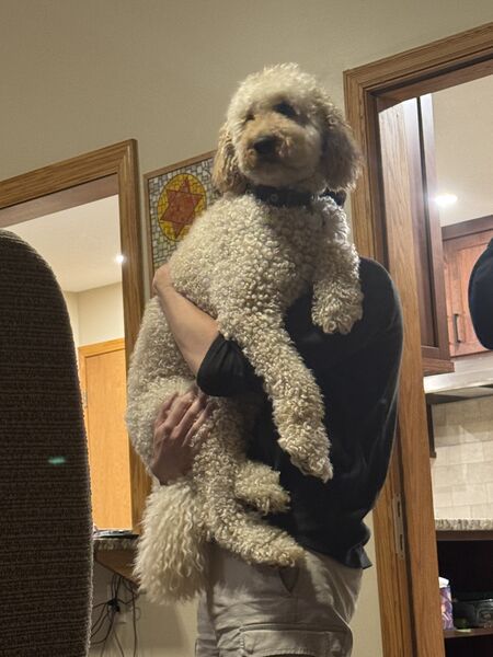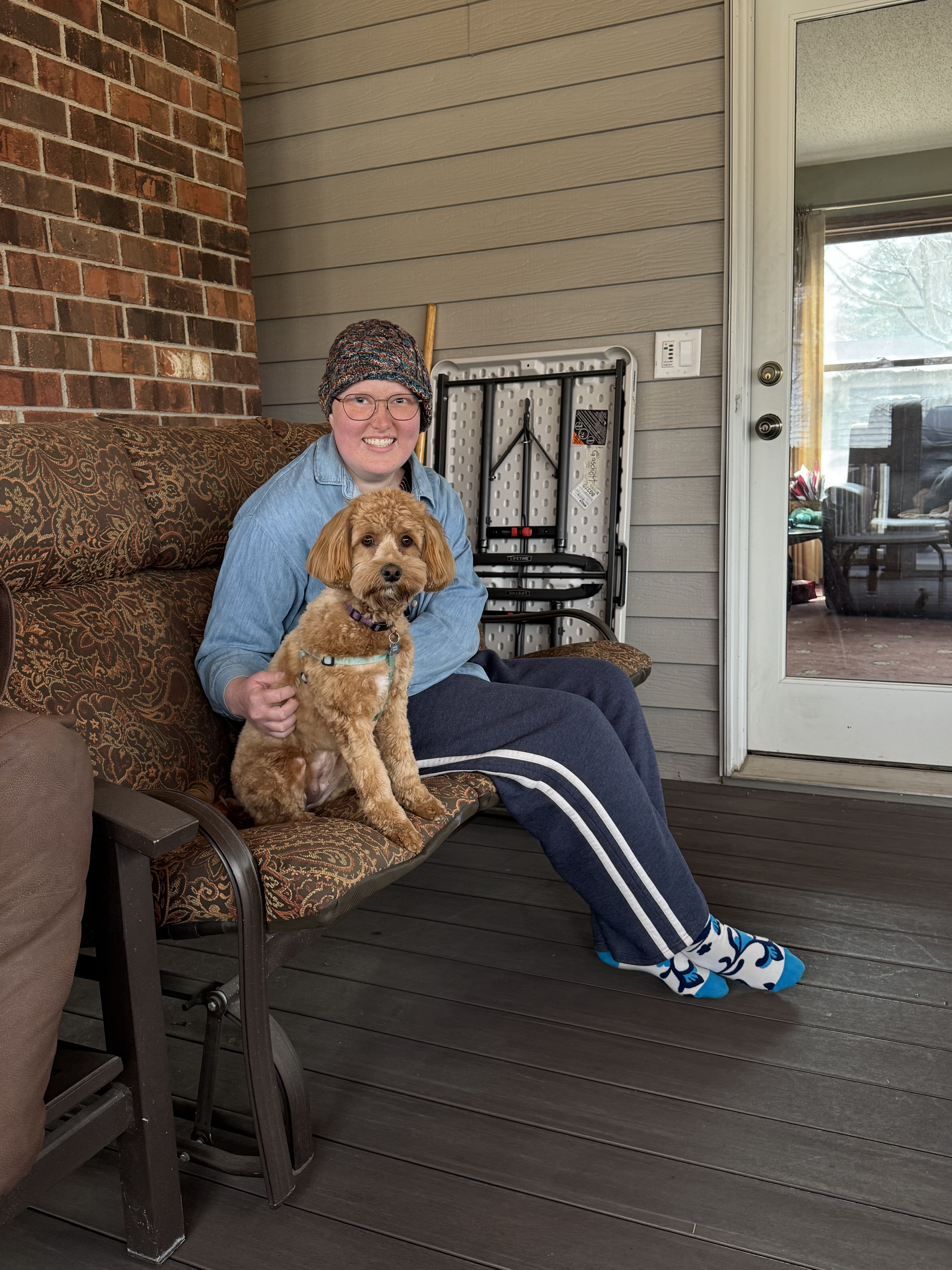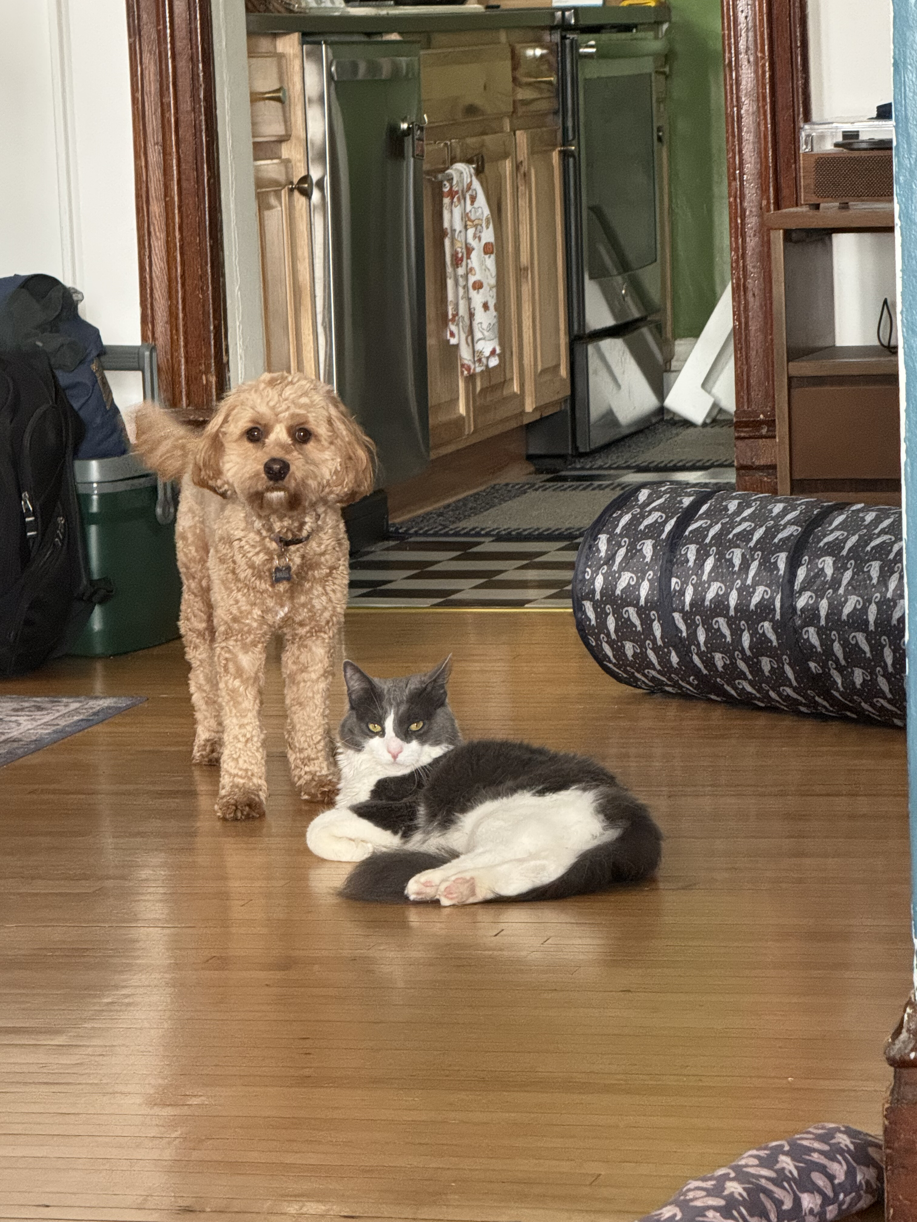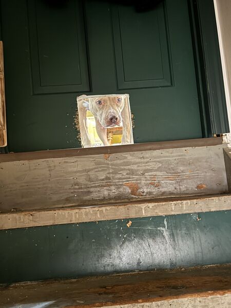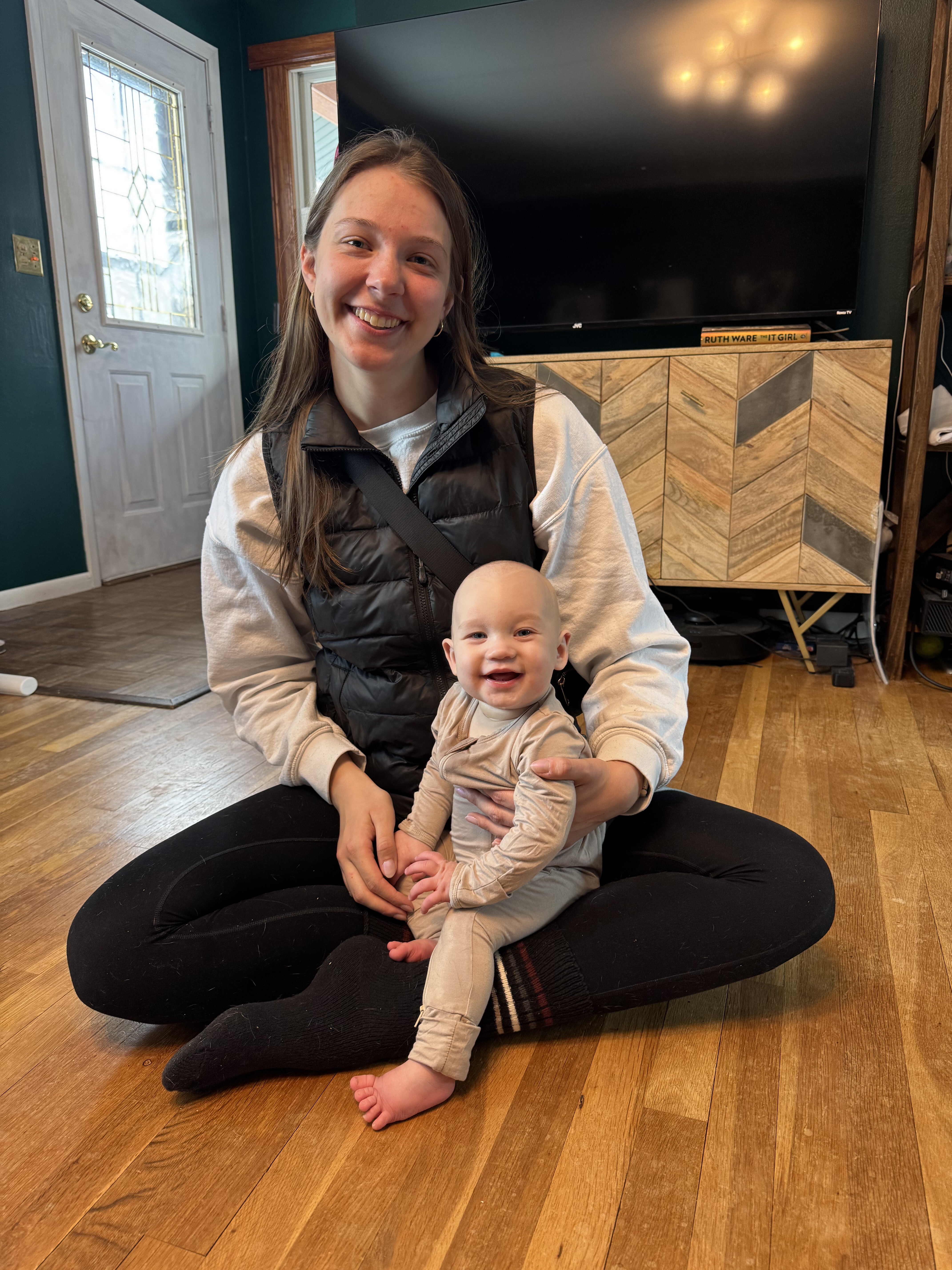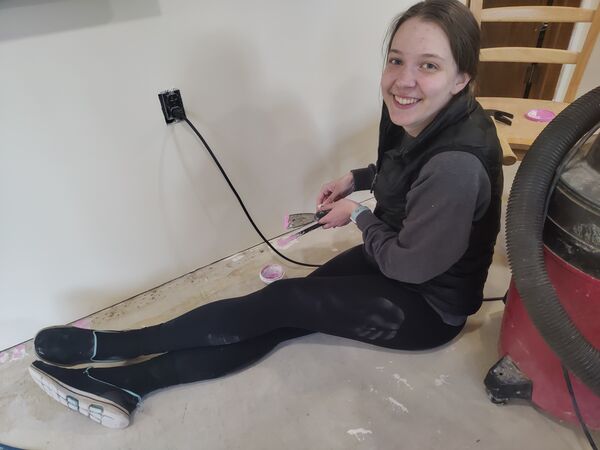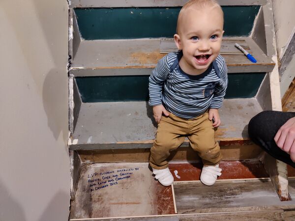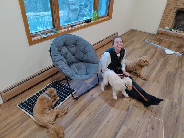 We had to make sure the floor installation was properly documented, so Chandler got Mabel to pose with the credits. Bodhi was not interested in modeling.