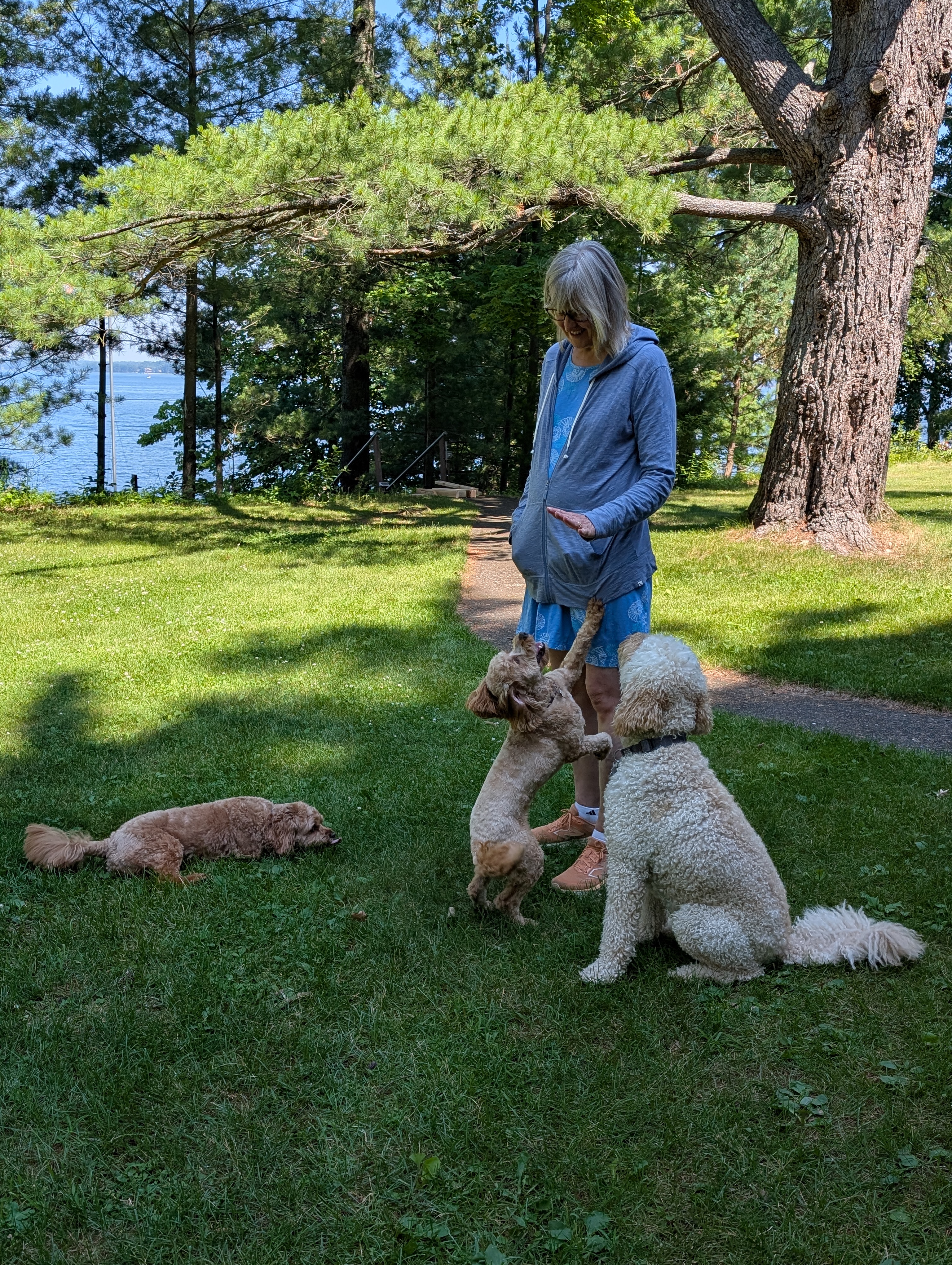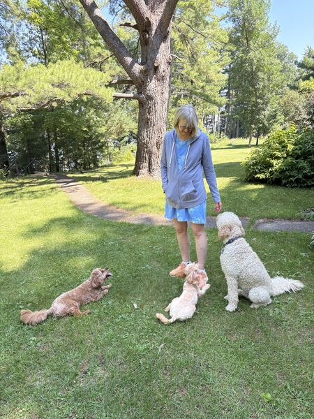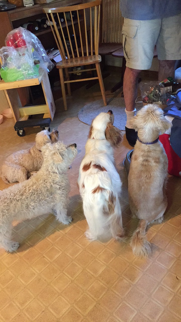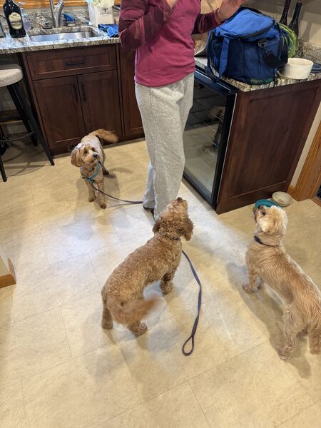 The dogs (Mabel, Bodhi, and a temporary friend Orzo) all know who holds the treats.