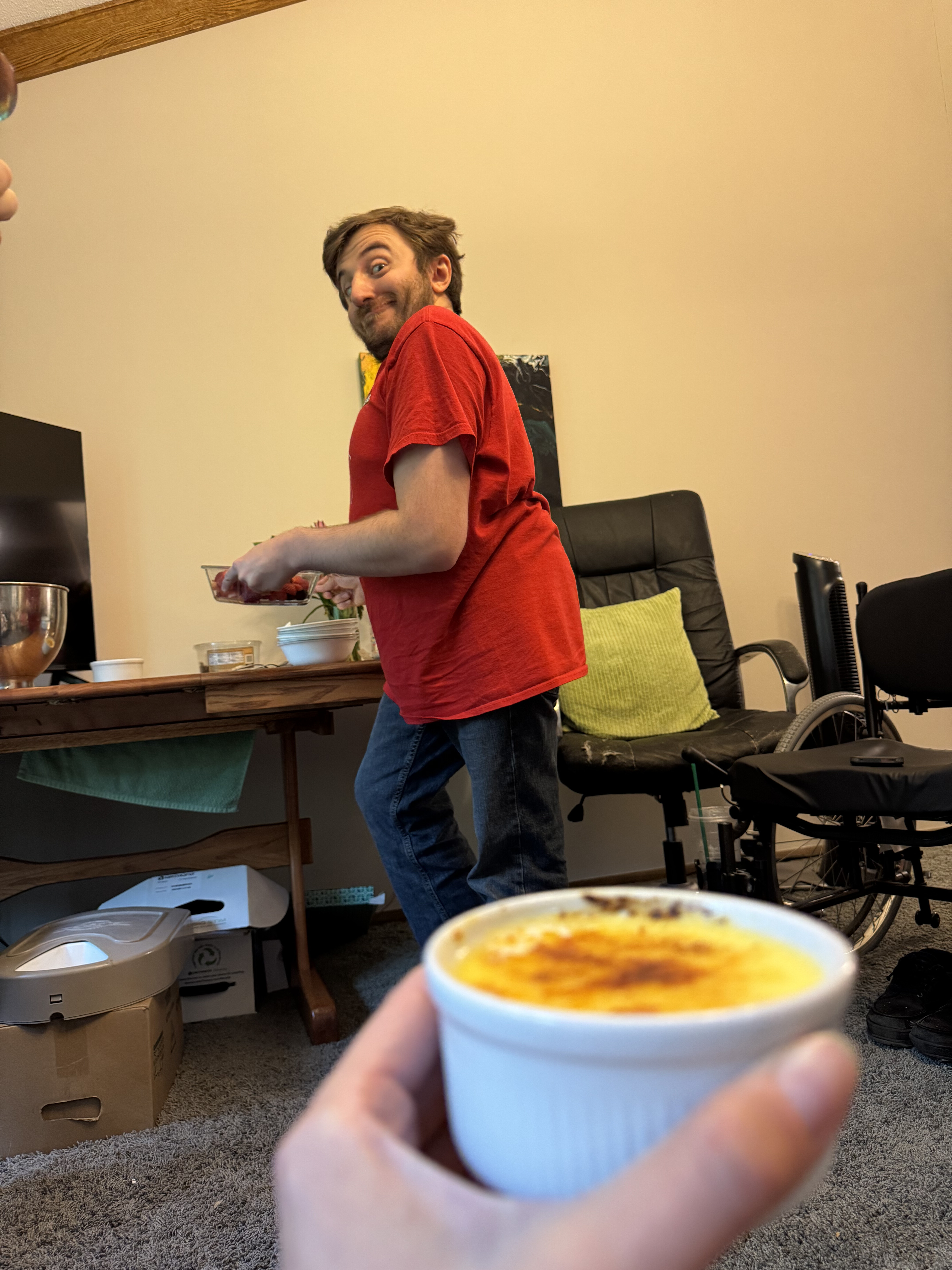 Greg got goose eggs (the animal products, not bumps to the head) from his work (something something partnered with a farm, something something go hang out with the animals? I don’t know) and decided to make crème brûlée, which we were delighted to partake in. Turns out, goose eggs are way bigger than chicken eggs (go figure) and therefore you only need a few to make the desserts!