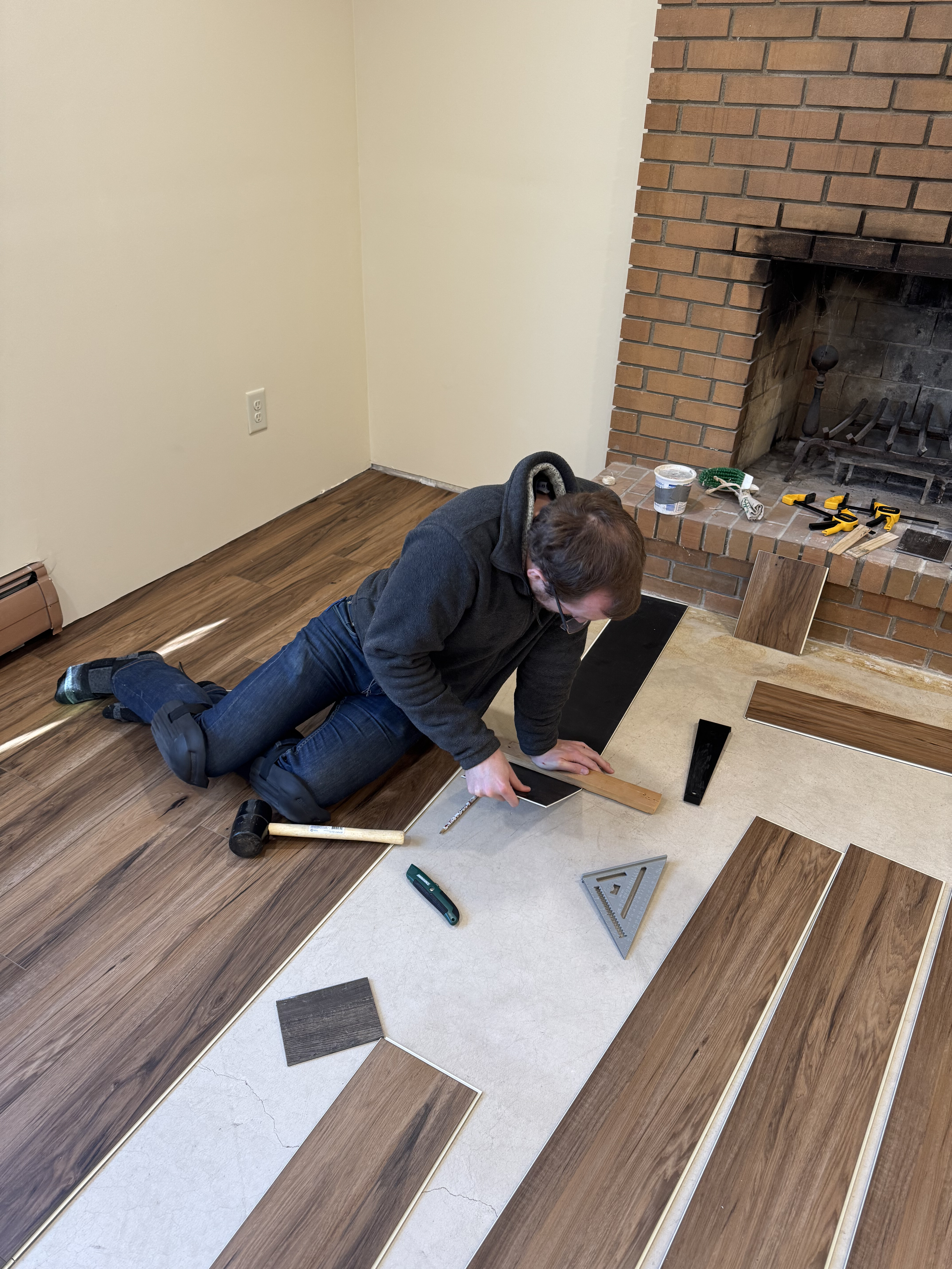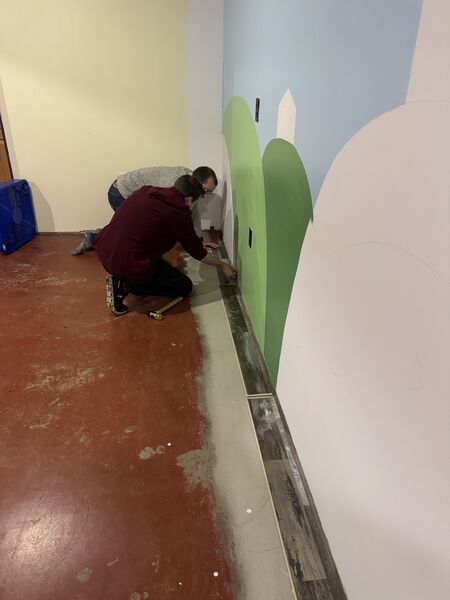 Upon setting out some of the vinyl floor pieces, we realized there were about 5 unique patterns. While not every board was identical, there were a few very distinct features in some of the patterns. So, while Chandler and Eric installed, Käthe sorted by pattern and chose which boards went where to avoid any pattern matching disasters.