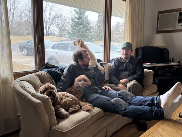 Flooring crew taking a break. Featuring (from left to right): Mabel, Bodhi (Trahans'), Chandler, Bailey (Eric's) and Eric.