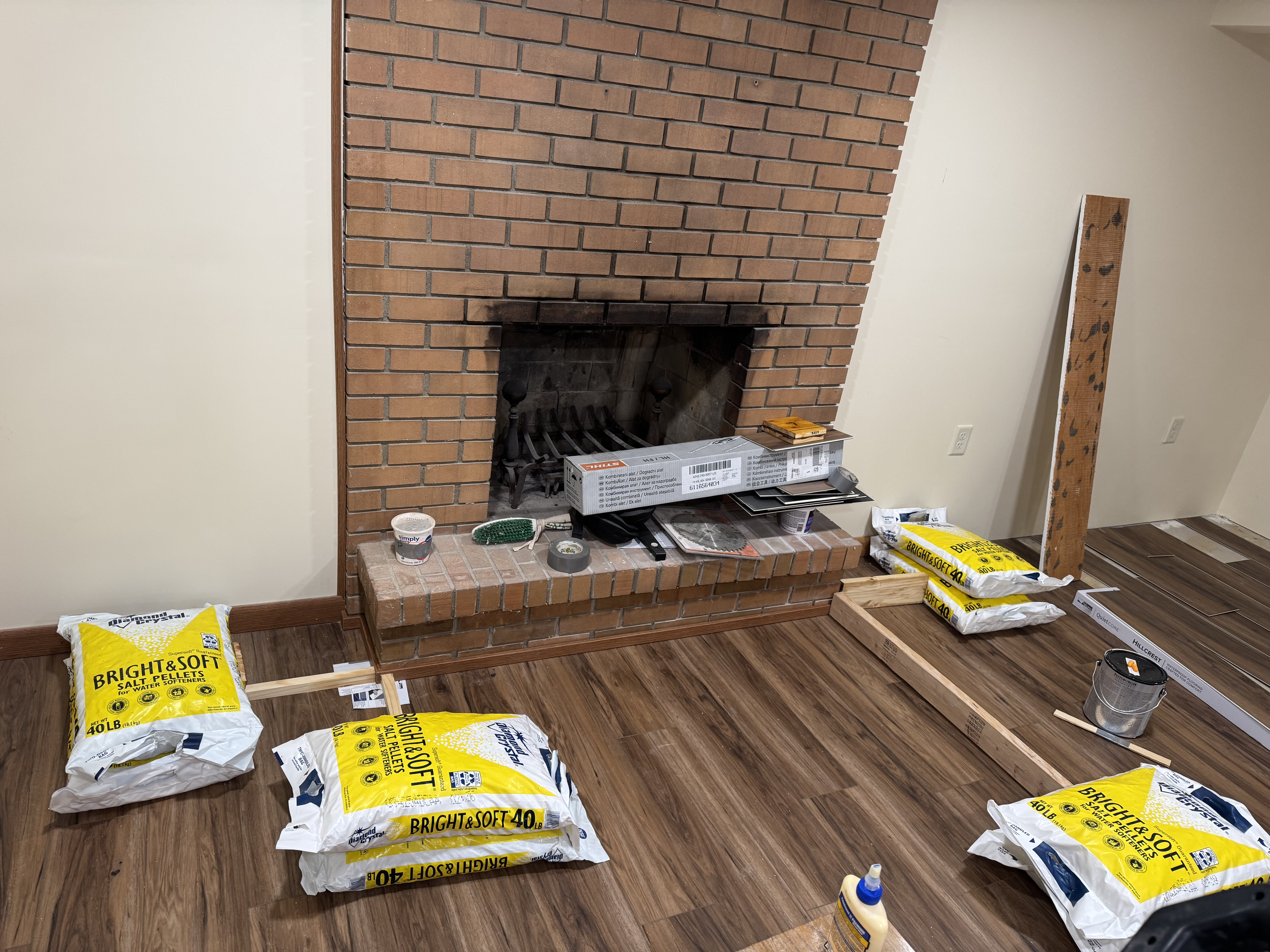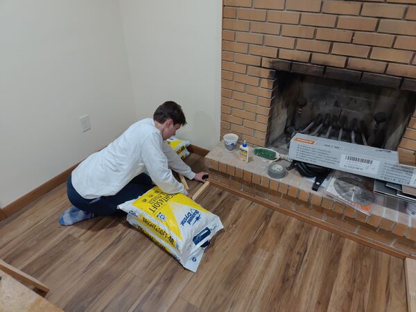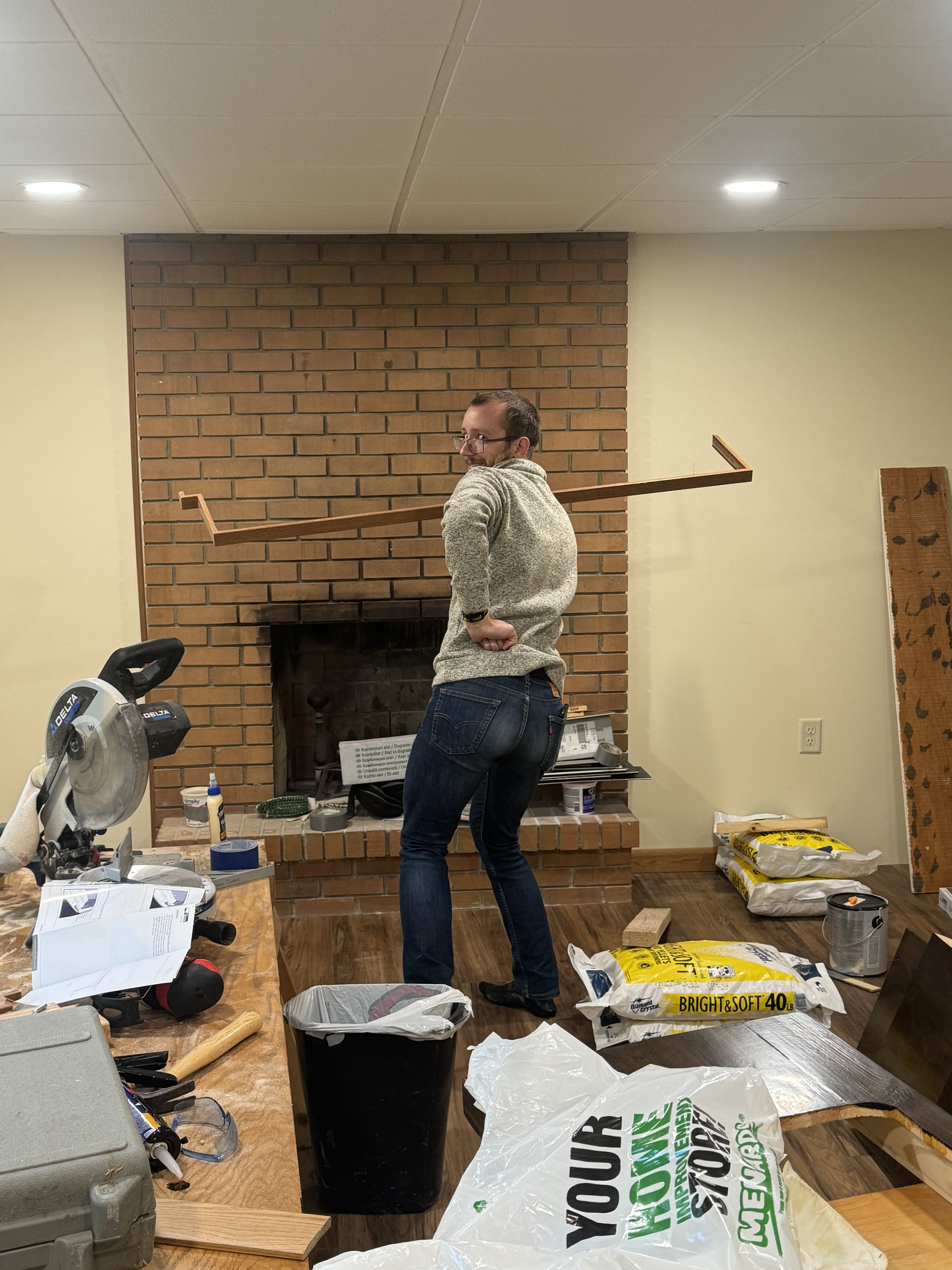 Käthe was determined to host her birthday party in a usable basement, so we worked on installing the fireplace trim and doing some light cleaning… These images are all from the day before the party.