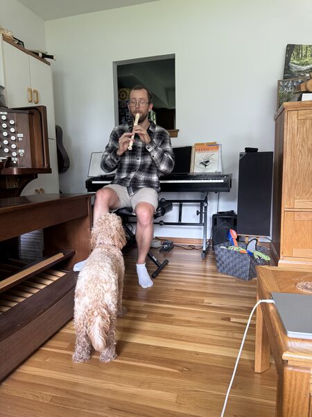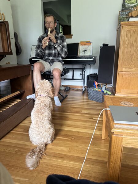 Chandler serenading Mabel, his biggest (and only) fan, with the recorder.